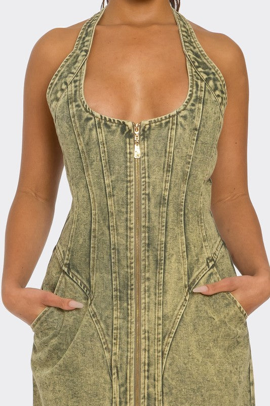 Turn heads in the Contour Fit Zip-Front Denim Midi Dress, a bold and structured take on modern denim fashion. This sleek halter-style dress is crafted in an olive acid-wash denim, featuring a corset-inspired silhouette that enhances your curves. The full-length front zipper adds versatility and edge, allowing for an adjustable slit, while functional side pockets bring an unexpected utility touch.