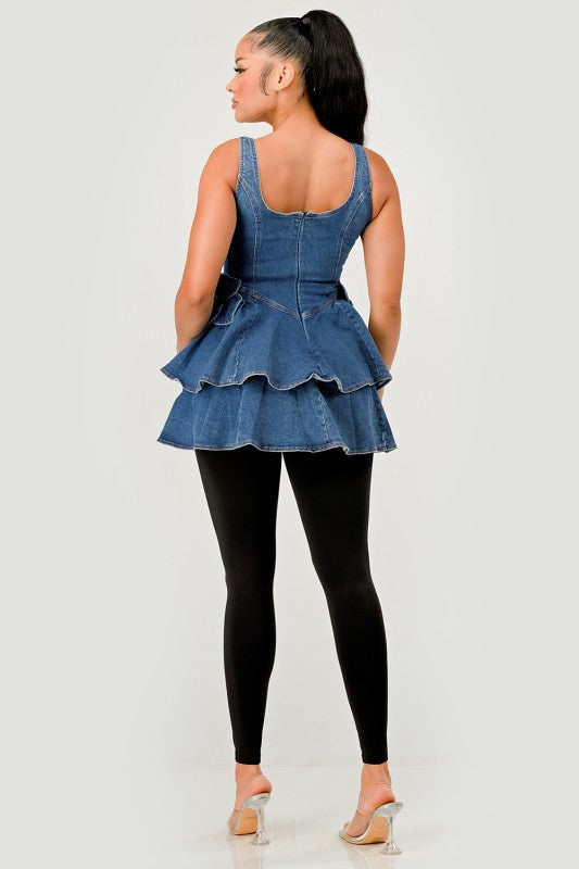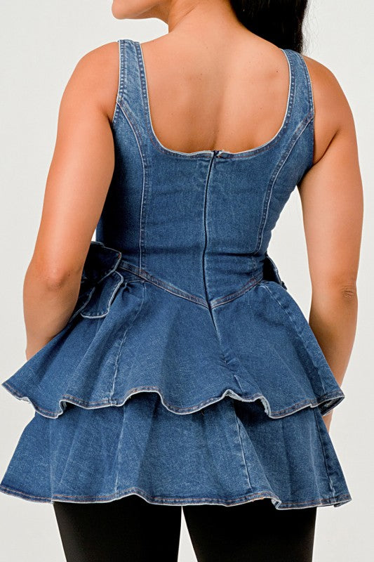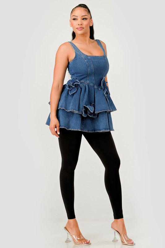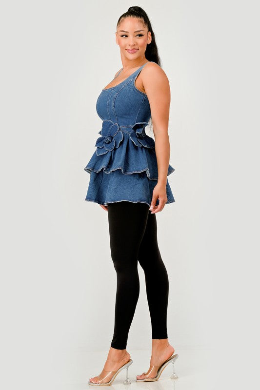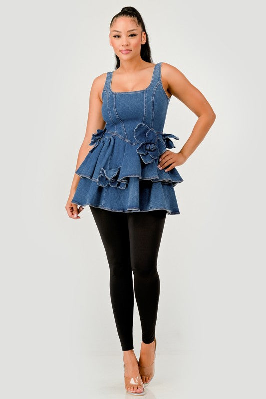 This denim peplum top is designed with a square neckline and fitted bodice for a flattering shape. The layered ruffle tiers create a playful silhouette while the side 3D floral appliques add a feminine touch. Made in a medium wash denim that is versatile and easy to style. Perfect to pair with leggings, jeans, or skirts for both casual and elevated looks.