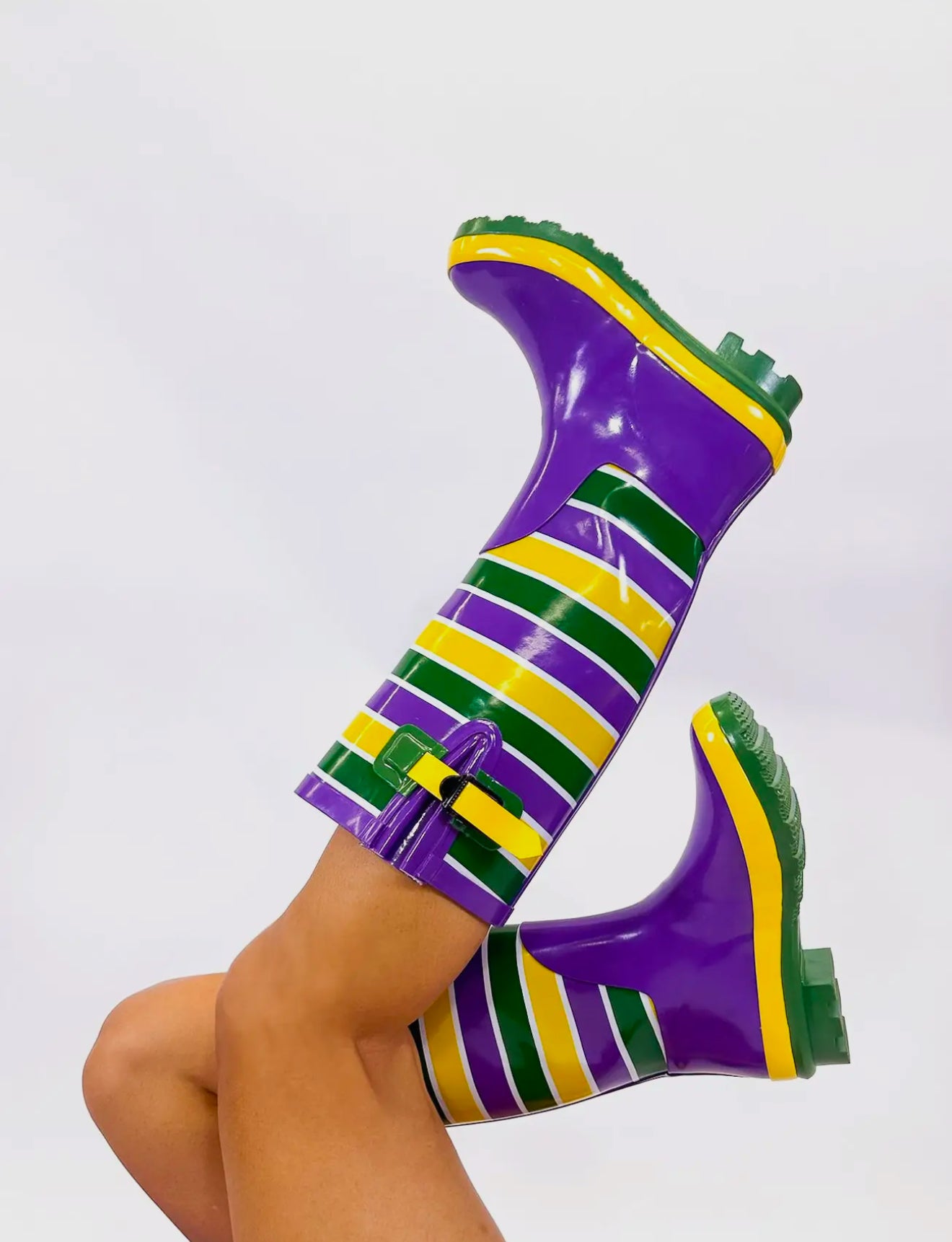 Step out loud and festive in these Mardi Gras–inspired rubber rain boots. Designed with bold purple, green, and gold stripes, these glossy boots bring celebration to even the rainiest days. The durable waterproof rubber keeps your feet dry, while the chunky treaded sole provides comfort and traction for all-day wear. A playful side buckle detail adds a stylish touch, making them perfect for parades, festivals, or turning everyday errands into a statement moment.