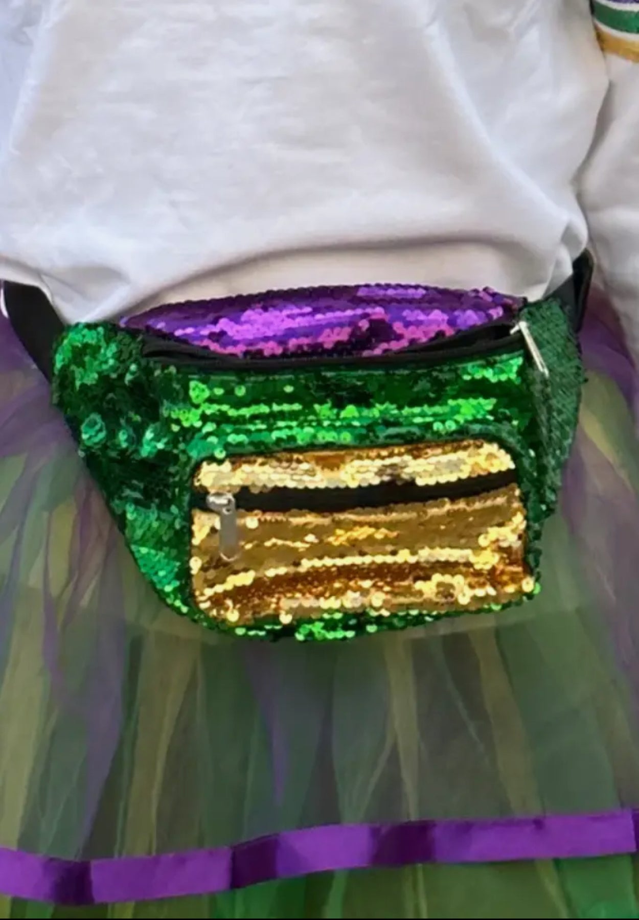The Mardi Gras Fanny Pak features a durable sequin design and multiple zippers, offering both style and functionality. With its secure compartments, it efficiently organizes essentials, making it ideal for events where accessibility and convenience are paramount. The shimmering exterior enhances visibility, complementing festive attire.