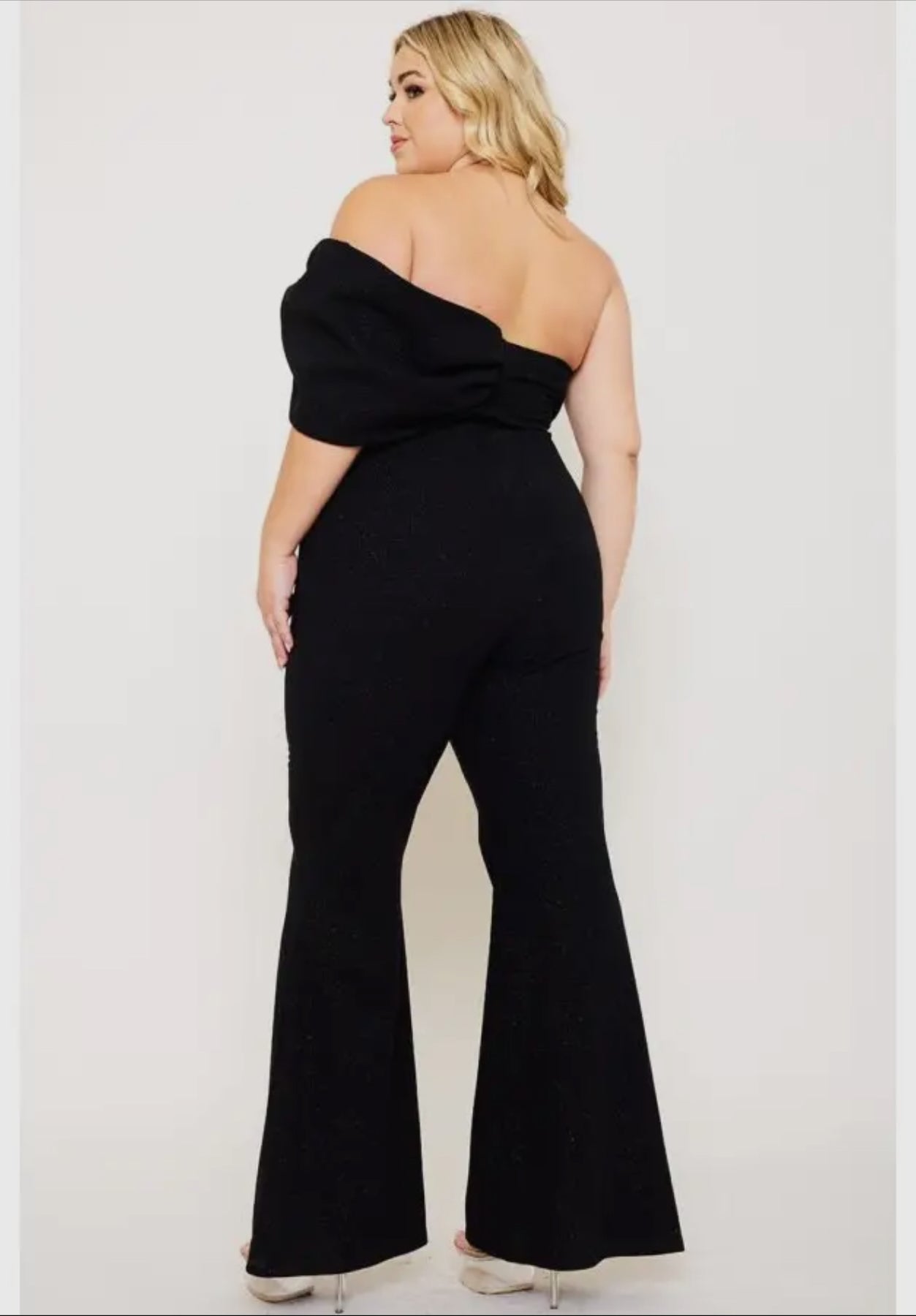This plus-size jumpsuit is the ultimate in elegance with an off-shoulder asymmetrical neckline and glittering fabric. The fitted bodice, flared legs, and draped shoulder detail create a bold and sophisticated look. Made of a comfortable blend of polyester and spandex with a fully-lined polyester interior, this jumpsuit is perfect for glamorous events and will make you look and feel amazing.