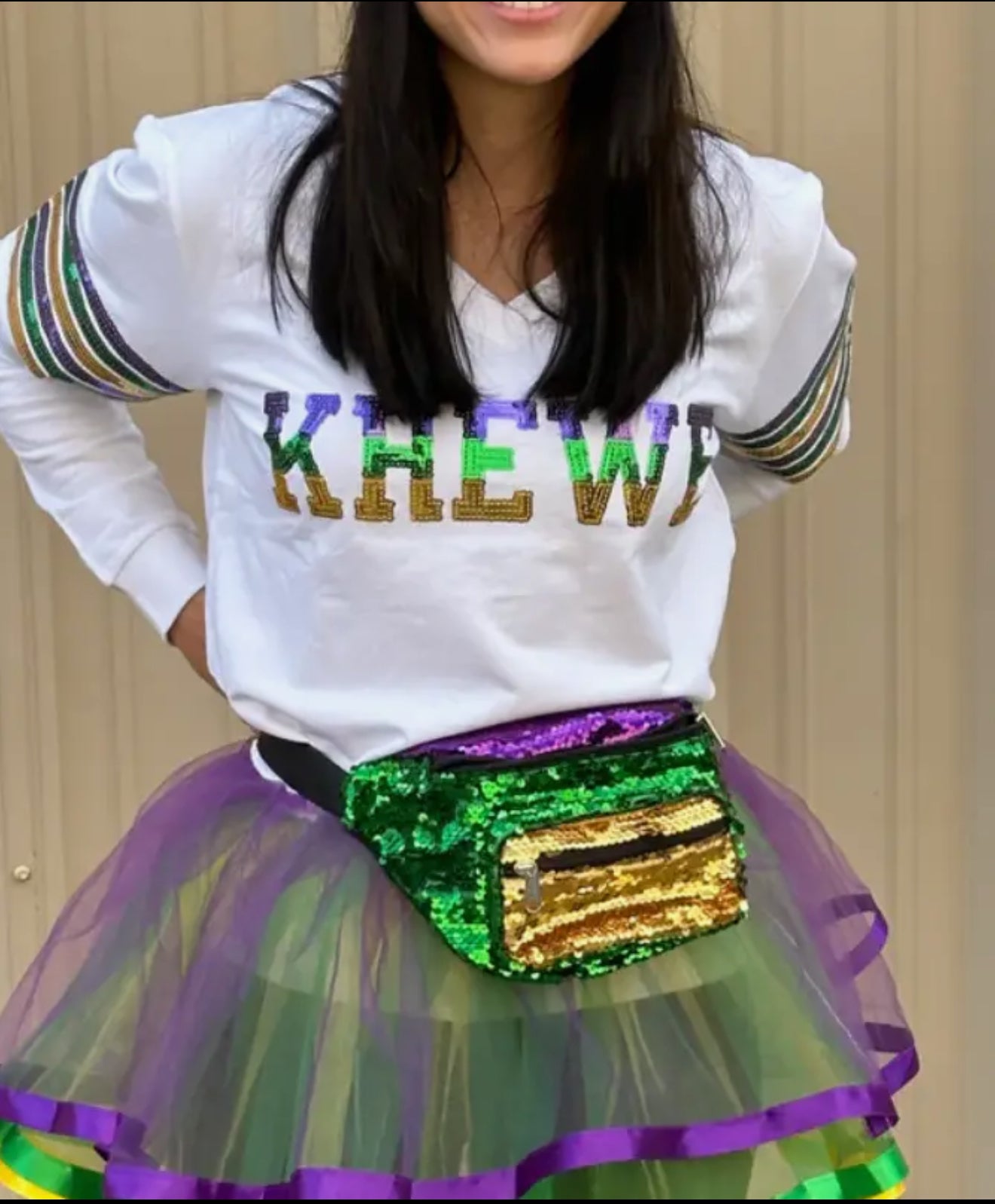 The Mardi Gras Sequin Crossbody Bag combines functionality with festive style. Its crossbody design ensures hands-free convenience, while the sequin embellishments offer a vibrant aesthetic suitable for celebrations. This purse provides an ideal accessory for events, allowing for easy access to essentials without compromising on flair.
