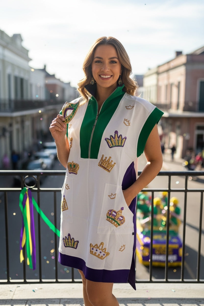 Elevate your Mardi Gras attire with this colorblock half zip dress, featuring a unique allover design of assorted crowns. Plus it offers versatility for layering over leggings or wearing alone. Available in sizes S/M through 2XL/3XL for a playful yet stylish look.