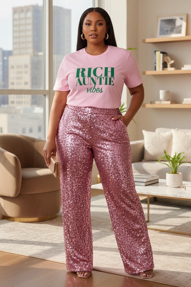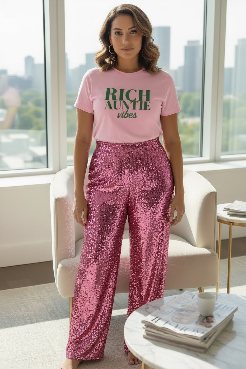 Channel luxurious "Rich Auntie vibes" with this stylish pink graphic tee. Discover your next power outfit.
