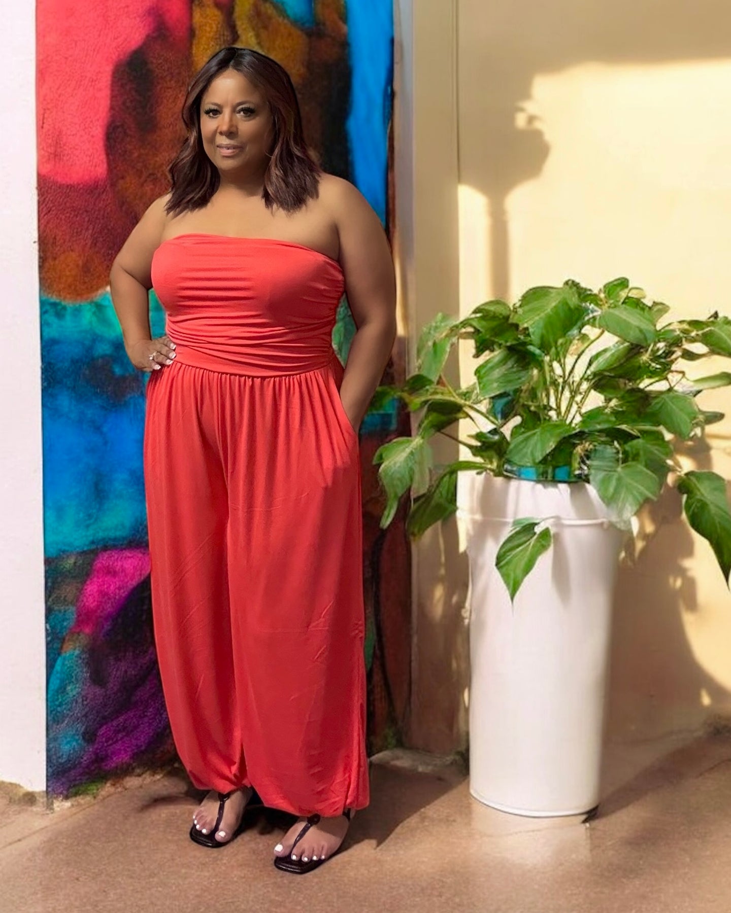 Get ready to turn heads in this plus-sized, orange strapless jumpsuit! Featuring ruching for a flattering fit, this jumpsuit is perfect for those who want to make a statement. Don't miss out on this trendy and fun piece!